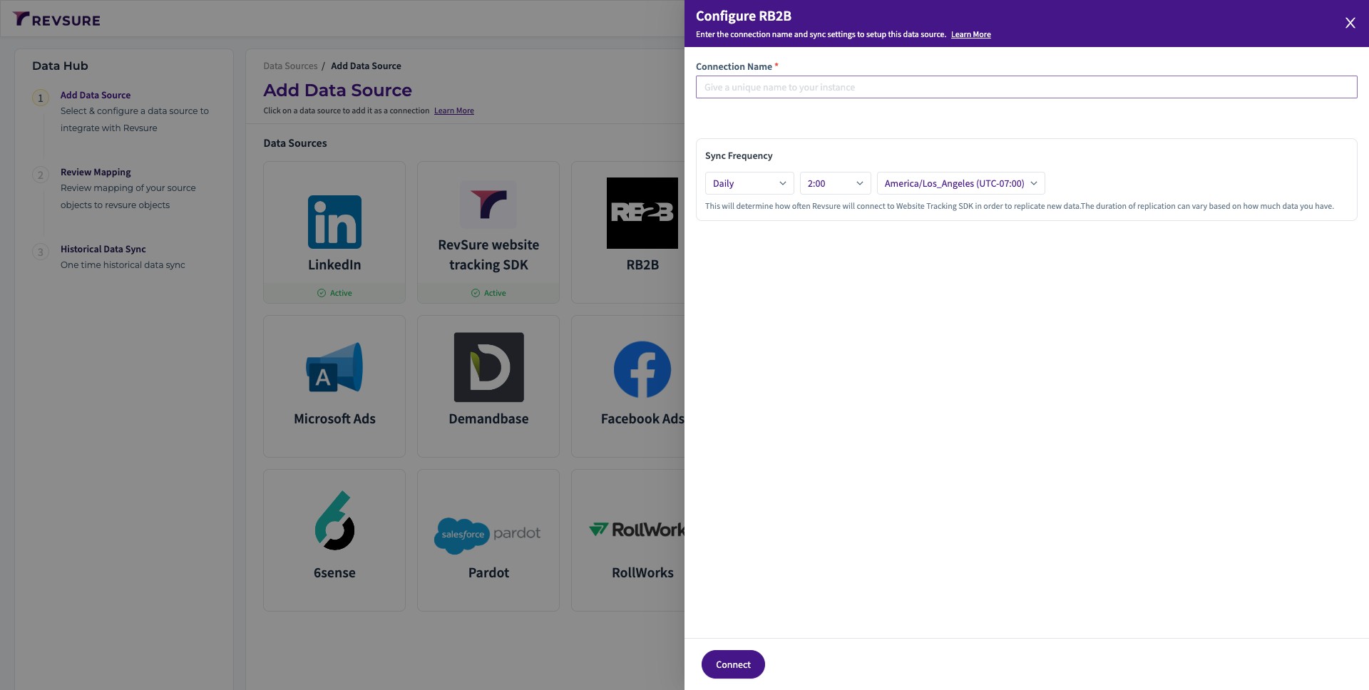 2. Select RB2B data source, and it will open a sidebar to configure the connection details